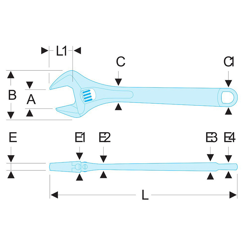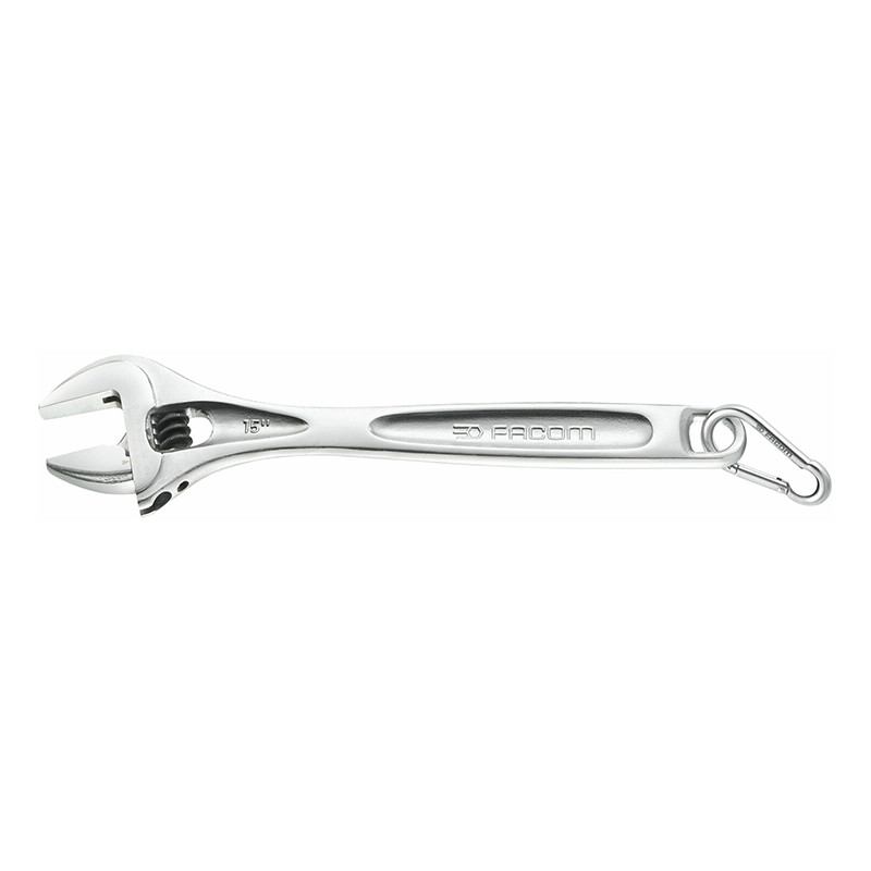 113A.12C Clé à molette chromée 12 pouces = Longueur 306 mm Bonne accessibilité à la molette = réglage facile. Mâchoire mobile non dépassante en position d'ouverture maximum. Préréglage de l'ouverture des becs grâce à une graduation millimétrique. Sens de rotation de la molette à droite. Gamme de 4" à 24". Clés à molette avec trou dans le manche : accrochage directe par mousqueton. Présentation : corps chromé et faces tête polies. Clé à molette 34 mm