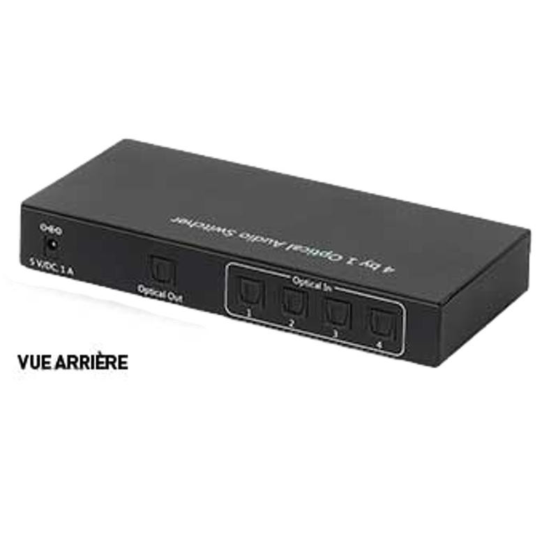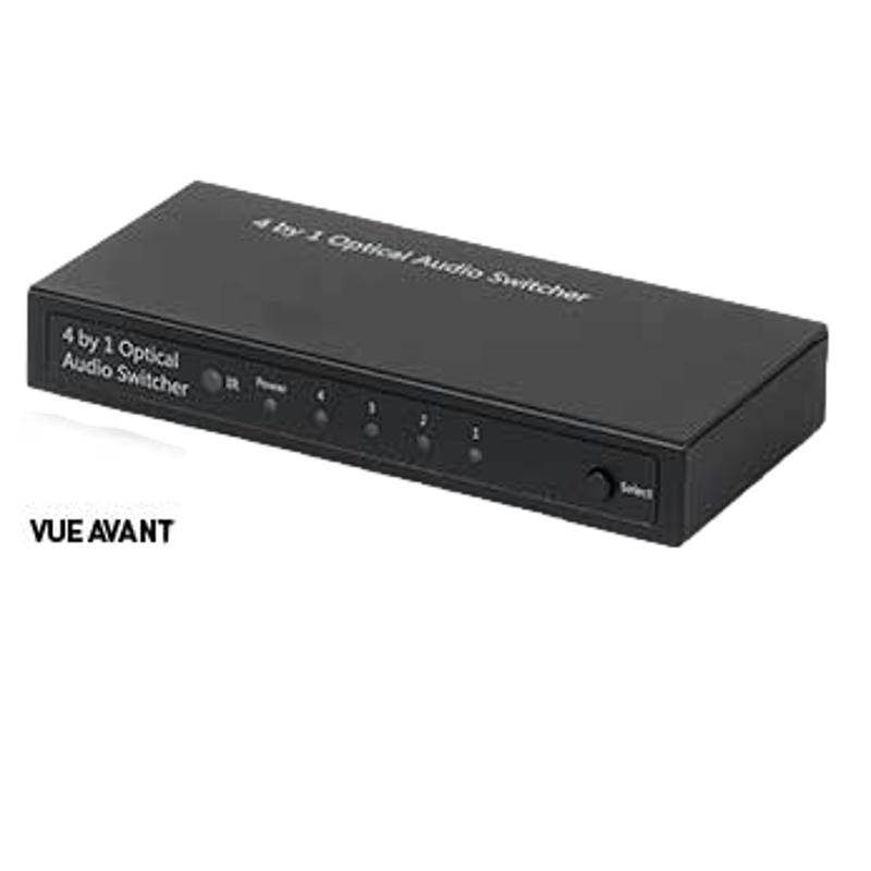 Ce commutateur permet de commuter 4 sources audio HD (ampli, chaîne, décodeur, écran...) vers un diffuseur audio (enceintes, barre de son, ampli...). Le chois de la source se faisant par une télécommande. 4 entrées TOSLINK 1 sortie TOSLINK formats audio: LPCM, Dolby 5.1 et DTS 5.1 dimensions (L x l x E): 154 x 69 x 22 mm