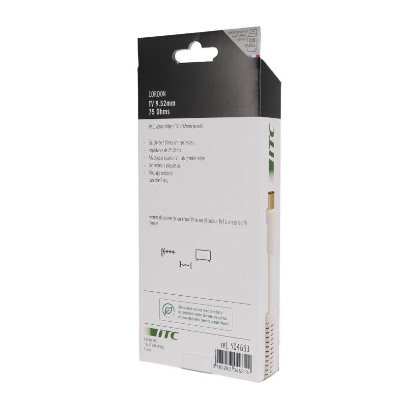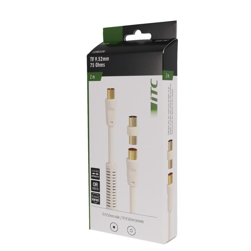 Désignation :Cordon TV 9.52 mm M/F + adaptateur TV 9.52 mm M/M - filtré - OR - 2m Type de produit : Cordon Connecteur A - genre : Mâle Connecteur B - type : TV 9.52mm Connecteur B - genre : Femelle Longueur (m) : 2 Finition : plaqués OR Garantie : 2 ans