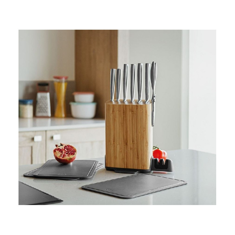 Bloc de couteaux multifonctionnel avec 6 couteaux : 1 couteau d'office 1 couteau utilitaire 1 couteau à découper 1 couteau à pain 1couteau de chef 1 couteau santoku Ainsi qu'un aiguiseur intégré et 3 planches à découper amovibles bloc de couteaux en bois avec un aimant puissant pour ranger facilement des ciseaux ou tout autre outil de cuisine magnétique.