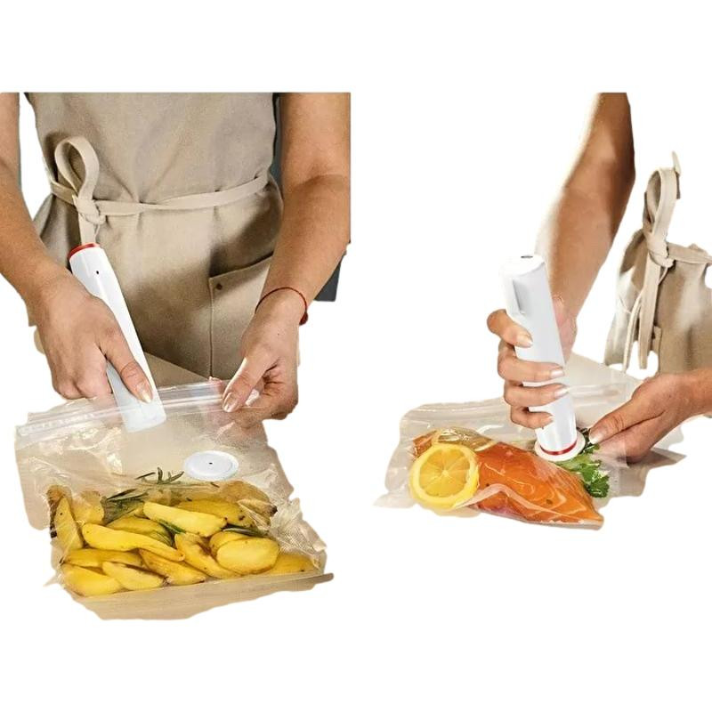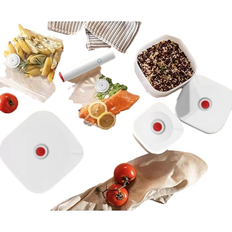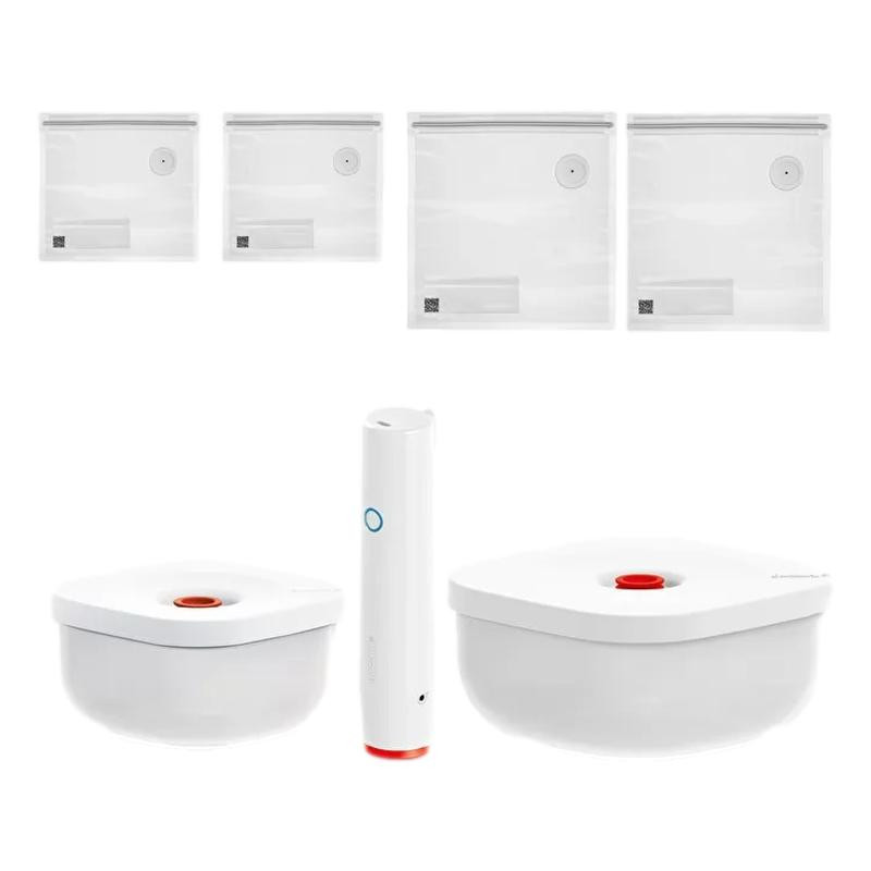 Le kit de mise sous vide Save-It, composé : une pompe électrique deux boîtes (450cc et 975cc) quatre sachets (deux petits sachets et deux grands sachets), Préserve la fraîcheur des aliments plus longtemps et réduit les gaspillages dus à la détérioration des aliments.
