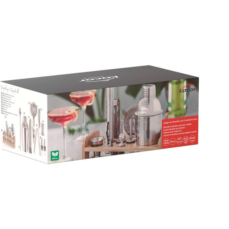 Kit complet barman - Accessoires de mixologie Composé de: cuillère à cocktail, shaker, mojito mace, passoire à vers, tire-bouchon, distributeur d'alcool, pince, bouchon, deux buses de serveur. + support Pièces faciles à nettoyer Matière inox 18/10° et capuchon en alliage de zinc Shaker 550 ml